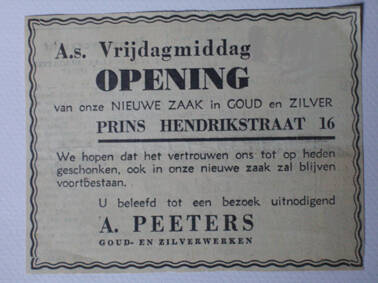 Van meet af aan stroomden de opdrachten binnen. Geallieerde militairen waren dol op sieraden waarin vooroorlogs muntgeld was gemonteerd. Talloze ringen, armbanden, broches en kettinkjes werden verkocht, later ook lepels, versierd met dubbeltjes, kwartjes, guldens en rijksdaalders. Ook verdwenen muntstukken in de smeltkroes want baar zilver was nauwelijks voorhanden. Al vlug kon mijn vader het werk niet meer aan en assisteerde zijn verloofde (mijn moeder) hem als leerling-goudsmid. Eenmaal getrouwd zou zij helpen in de winkel. Na het vergissingsbombardement van februari 1944 was er in het geruïneerde Nijmegen nauwelijks bedrijfsruimte voorhanden. Pas in 1950 kwam een huurpand vrij in de Prins Hendrikstraat. Hier startte de juwelierszaak, gesteund door een eigen, goed geoutilleerd atelier. Het huidige winkelpand met woonhuis in de Van Welderenstraat werd twaalf jaar later aangekocht. Liefst vier decennia voerde mijn vader een meesterteken: zijn initialen ‘A-P’, gevat in de contour van een liggende ruit.